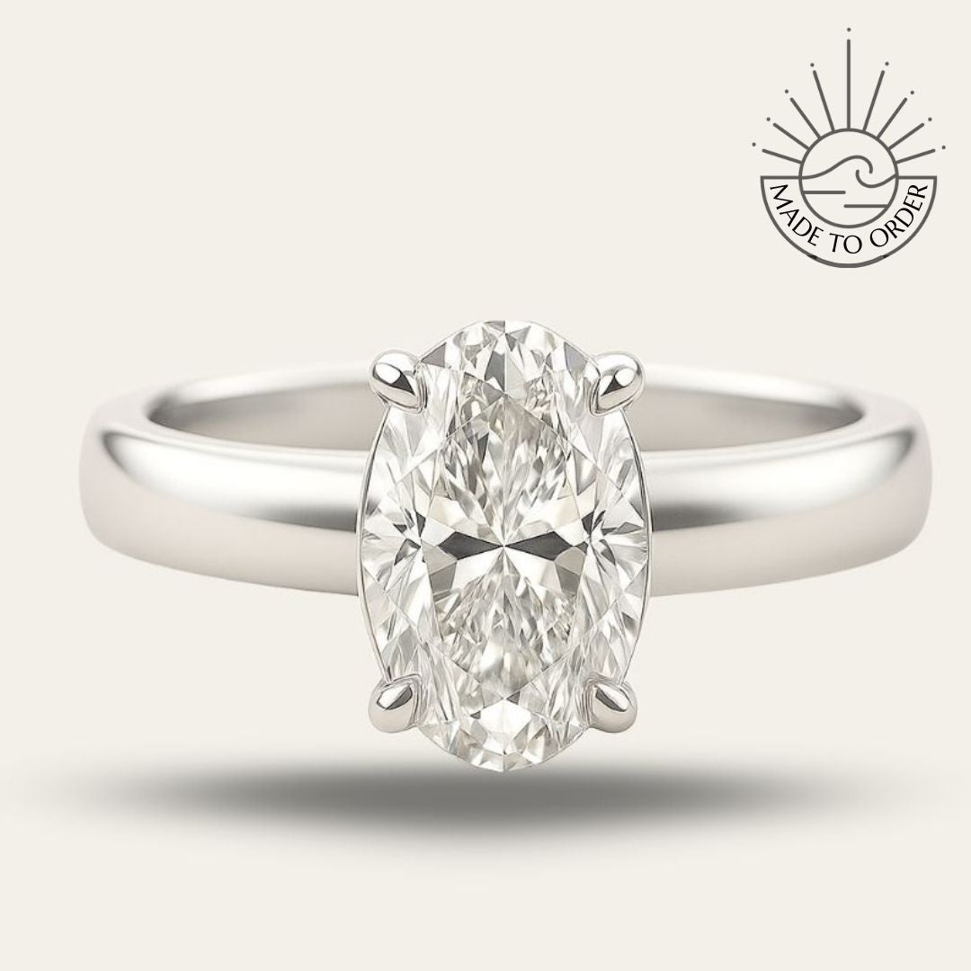 Inspired by ancient Celtic nobility and reimagined for the modern luxury woman, the Isolde Ring represents the perfect fusion of historical elegance and contemporary consciousness. This magnificent piece showcases a breathtaking 1.2-1.5 carat lab-grown diamond, expertly cut in an oval faceted shape that reflects the light with exceptional brilliance.