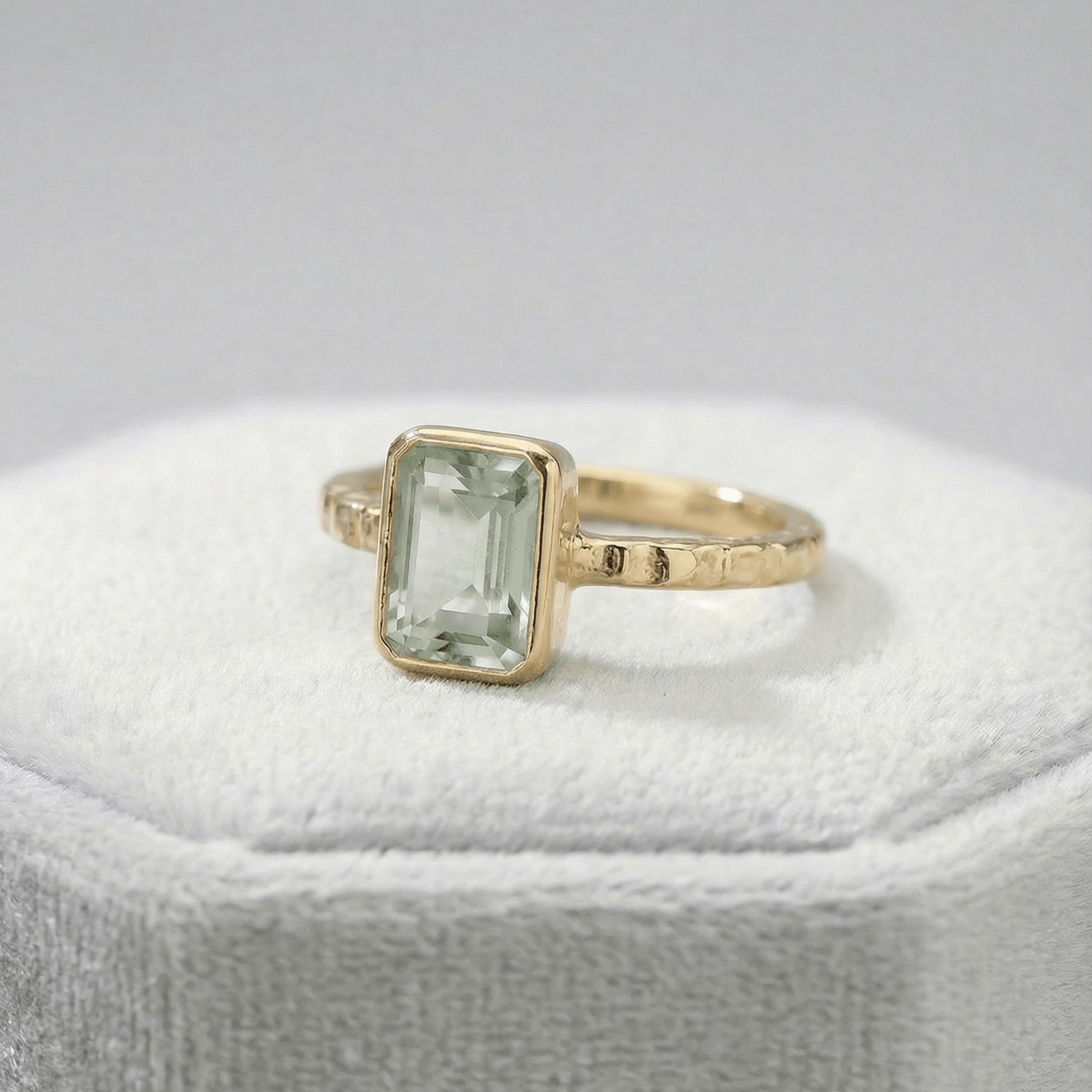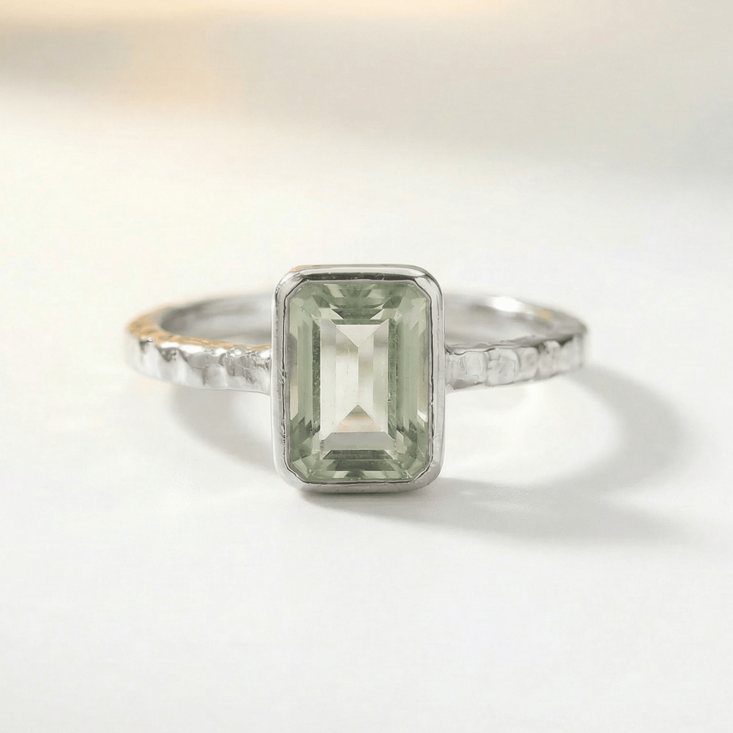 Tidewashed Green Quartz Ring - Octagonal Gemstone & Hammered Band