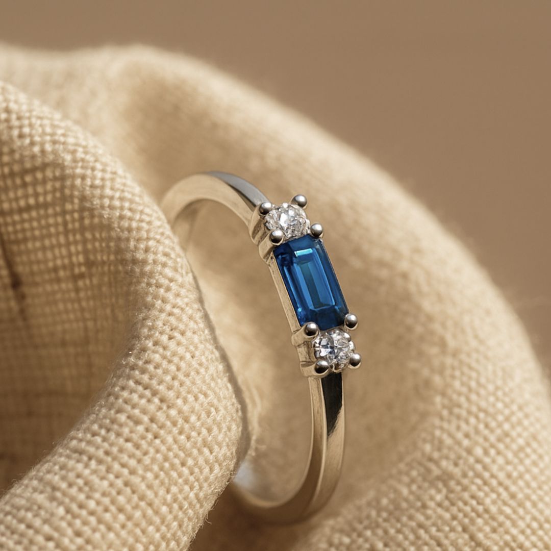 Named after the Persian word for 'bright dawn', the Roxana Ring captures the mystical depths of twilight with its stunning London Blue Topaz. This enchanting piece features a 5x3mm rectangular gemstone, its deep blue hue perfectly complemented by two brilliant 2mm lab-grown diamonds set in lustrous 9ct white gold. Like the first light breaking through a sapphire sky, this ring tells a story of delicate strength.