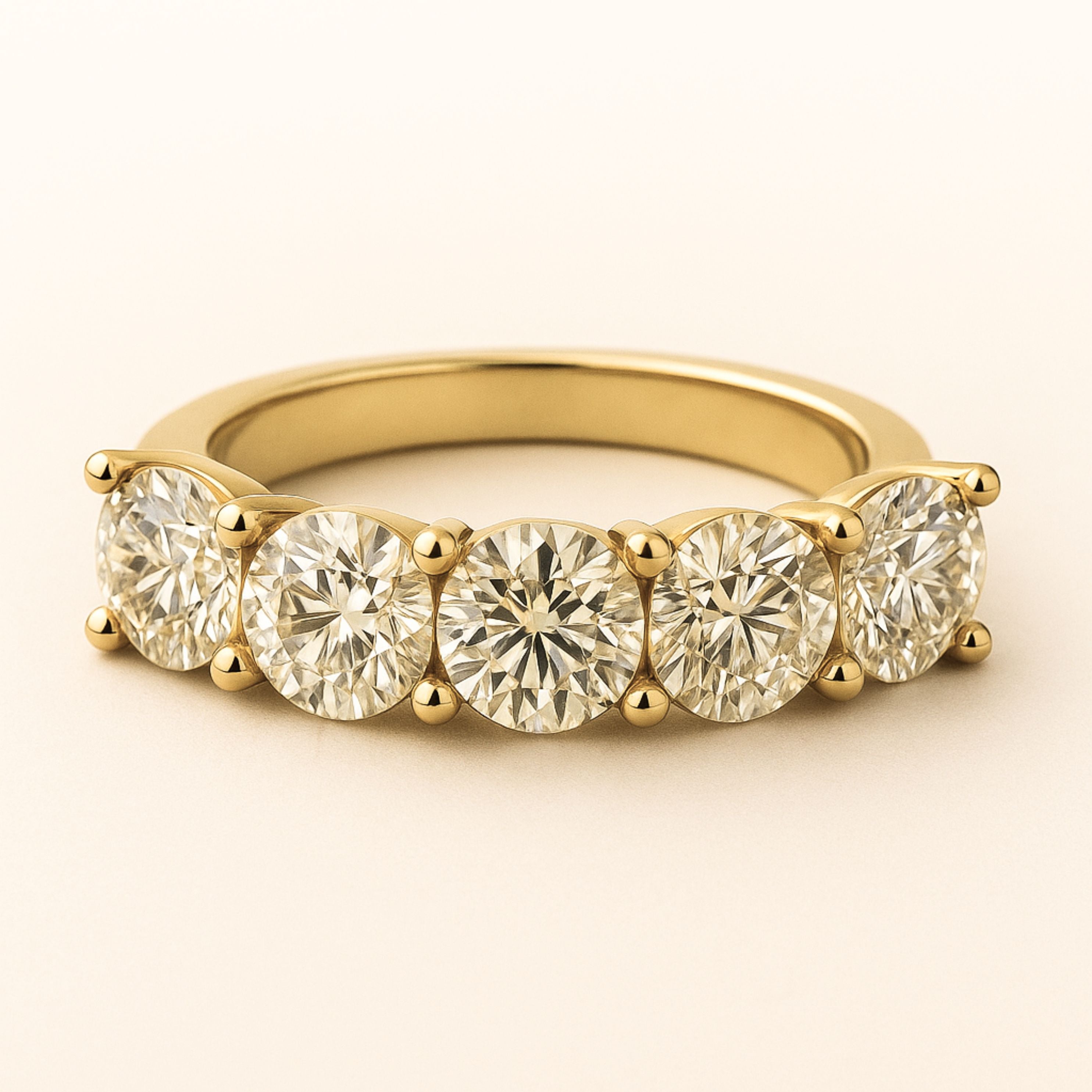 Introducing the Cerys Ring, a timeless celebration of enduring love. This elegant five-diamond ring showcases five perfectly matched round brilliant-cut lab-grown diamonds- at total of 3.5cts, each representing a cherished chapter of your love story - past, present, and future together.