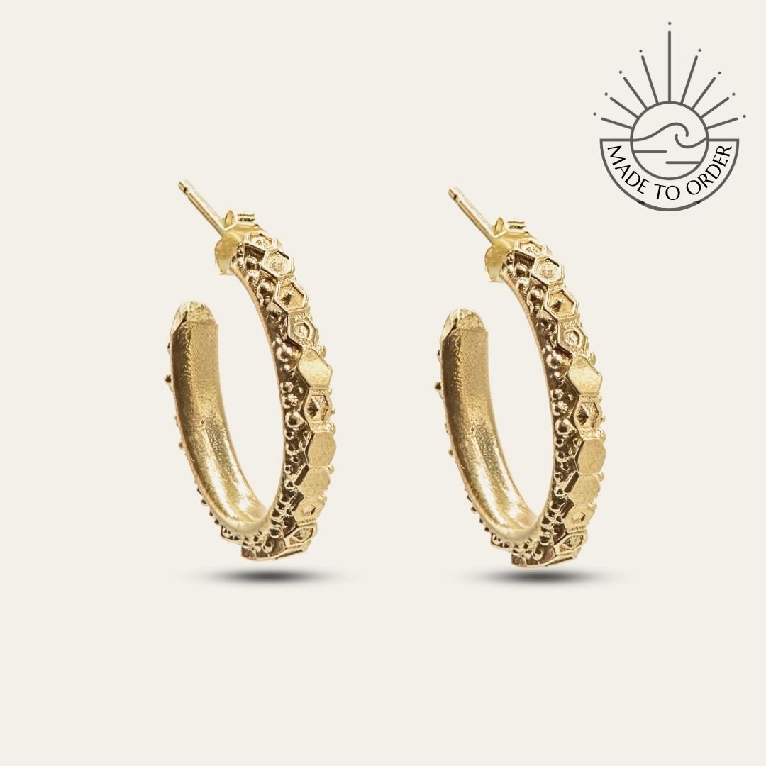Give your everyday style a golden glow with the Hebe Earrings from the Utopia Collection. Made from luxurious 9ct gold, these beauties have a delicate yet bold design, with geometric shapes and intricate granulation that sparkle as they catch the light. Inspired by the goddess Hebe- who represents youth, renewal, and fresh beginnings.