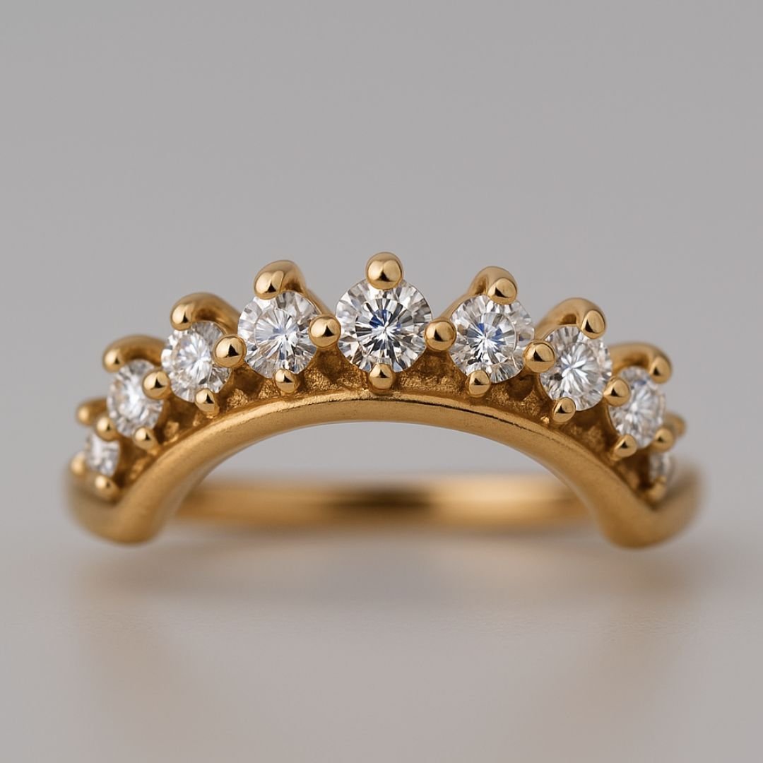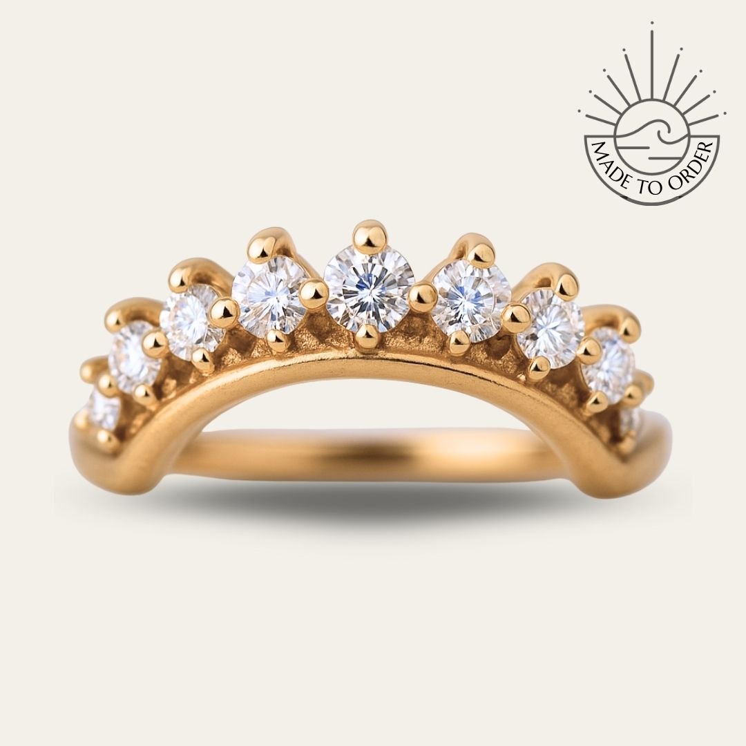 From our AWËN Collection comes a piece of pure radiance - The Nora Ring. Taking its name from the Arabic word for 'divine light', this ethereal creation features a magnificent half-halo of seven lab-grown diamonds that dance with light and purpose. Each 2mm brilliant-cut diamond is thoughtfully positioned to create a cascading arc of brilliance, reminiscent of the first rays of dawn.