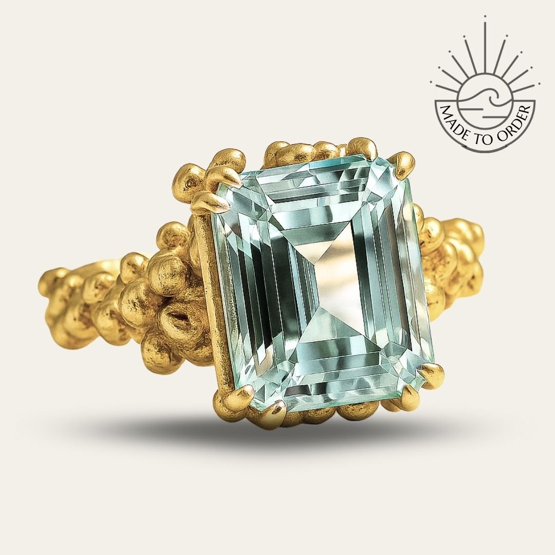 Part of our Fine Jewellery collection, the Seraphina Ring is a unique masterpiece that brings nature's beauty to life. Created using organic materials like oats, quinoa, and poppy seeds, this stunning ring is cast in solid 9ct gold and finished with a granulation technique, creating the perfect setting for a breathtaking 12x10mm Ocean Blue Beryl gemstone (5 carats).
