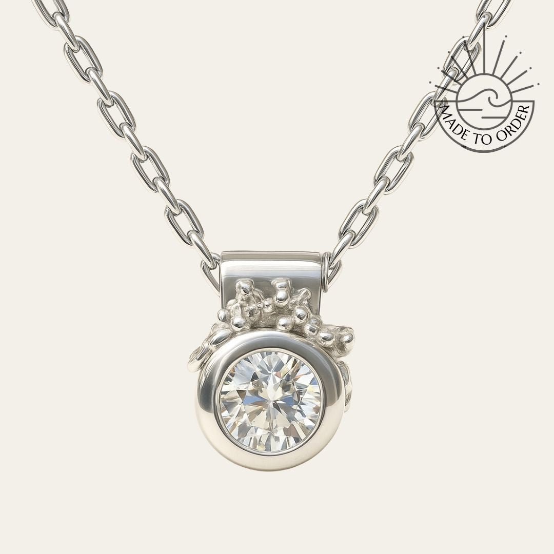The Stella Necklace features a lab grown diamond in white gold with granulation detailing and hayseed chain design. This handmade diamond necklace combines ancient techniques with sustainable luxury.
